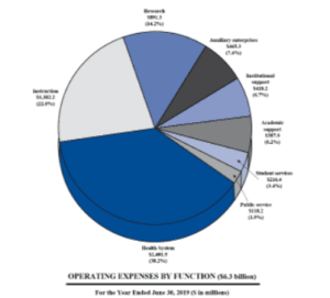 Revenue % Health System $2,508,900,000 37.96% Tuition & Fees $1,814,200,000 27.46% Government Grants $608,600,000 9.21% Other Income $1,195,176,000 18.08% Auxiliary $482,089,000 7.29% Total Operating $6,609,965,000 100.00%