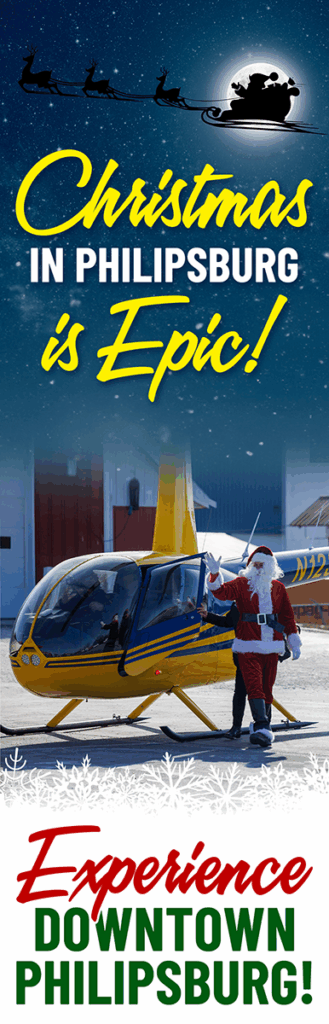 A billboard on the western edge of Philipsburg greets Route 322 motorists with a photo of Santa Claus exiting a bright yellow helicopter. The message above it: “Christmas in Philipsburg is Epic!”