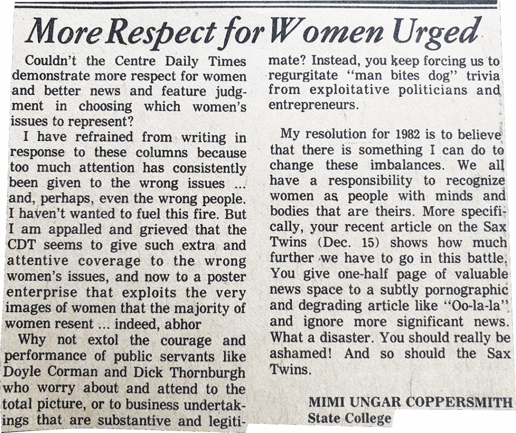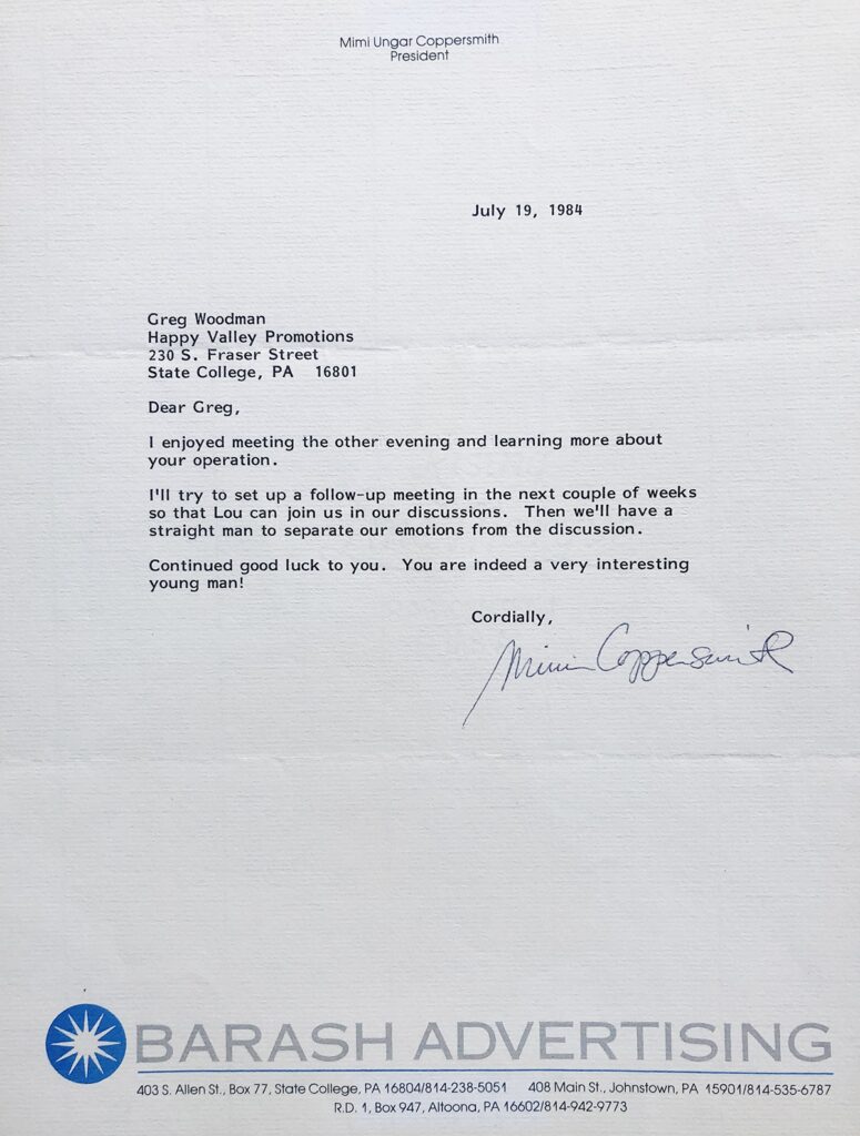 Mimi had a way of shaping careers, often without you realizing it at the time. She certainly shaped mine. My first product as a college student through Happy Valley Promotions, a poster featuring twins on the Nittany Lion, caught her attention in 1982. In a letter to the Centre Daily Times, she blasted the coverage as “appalling,” “a disaster,” even “pornographic.” She said the paper should be “ashamed,” and so should the twins. It was classic Mimi: bold, uncompromising, and willing to stir controversy when the moment demanded it.